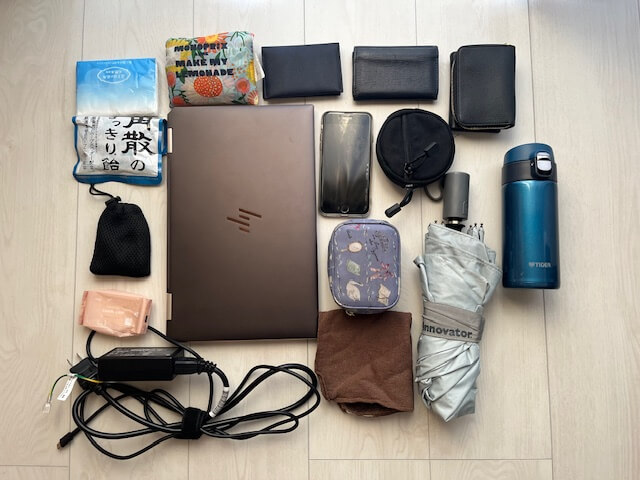 PC / 充電器 / ポーチ / タオルハンカチ / ポケットティッシュ / 折り畳み傘 / 水筒 / コインケース / 携帯 / 財布 / カードケース/ 名刺入れ / イヤホン / のど飴 / エコバッグ / ウェットティッシュ
