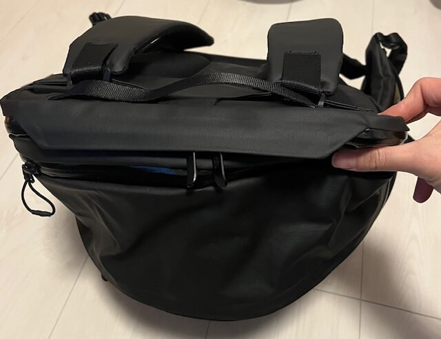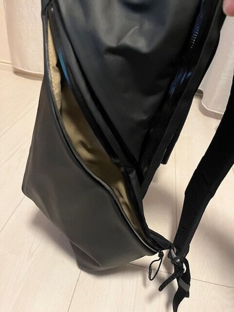 外側に露出する部分には止水ファスナーが使われているため、雨の日でも安心して使えます。