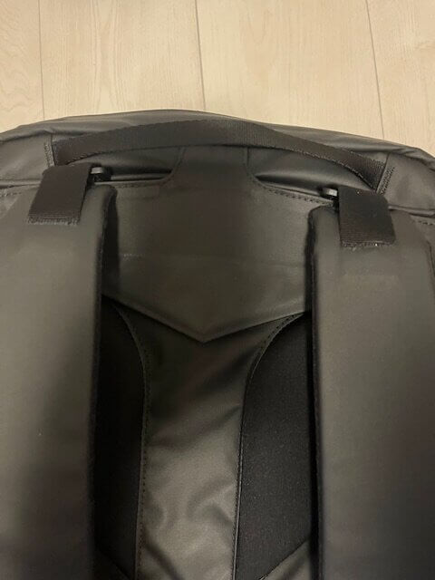 リュック上部に細いホルダーが付いていますが、伸縮性がなく本体に沿う形なので、少し掴みにくいです。