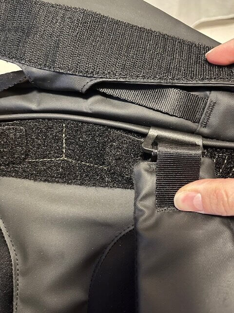 ショルダーハーネスの付け根はマジックテープで固定されており、
